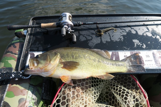 岸から少し離れた位置で何もない場所だったので、恐らく回遊系のバスに当たったんだろう。水深はおよそ3~4mくらいで底を取りながらスイミングしていたので割と深い場所で食ってきました。
