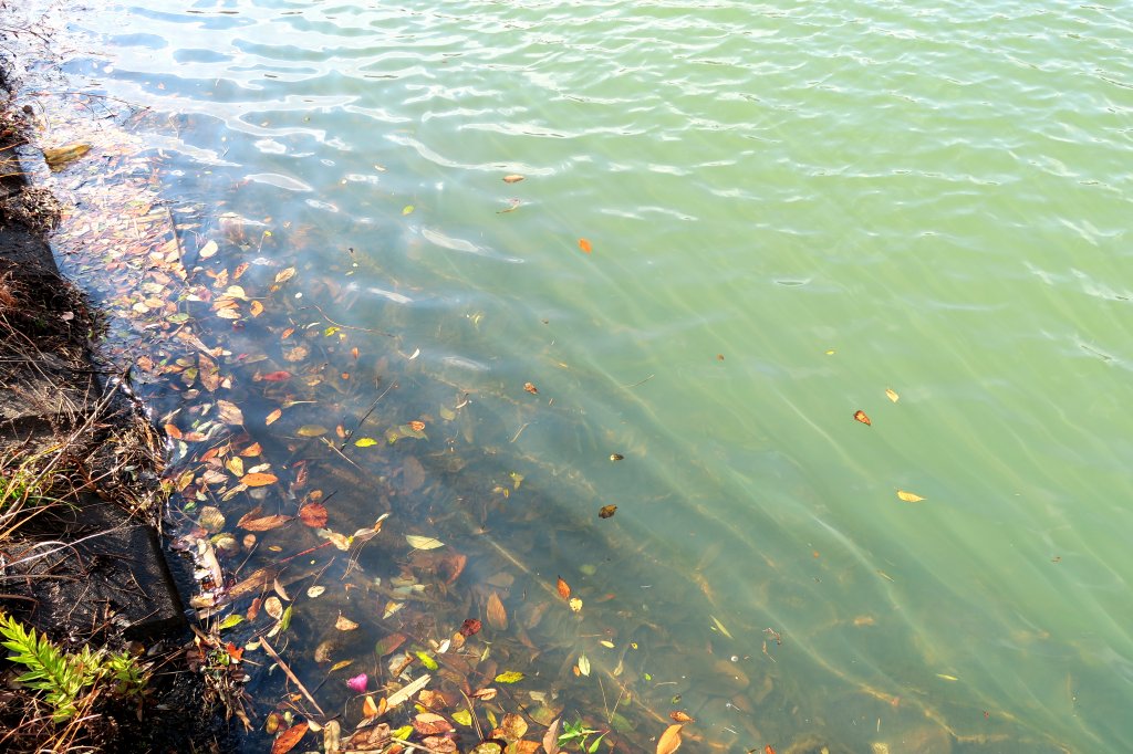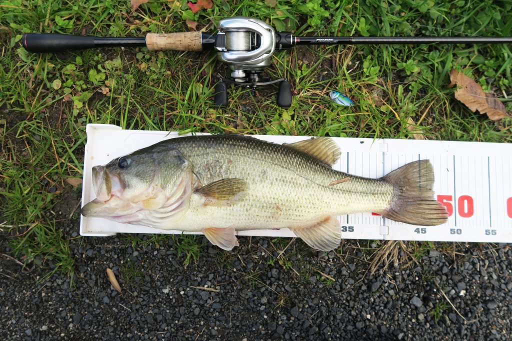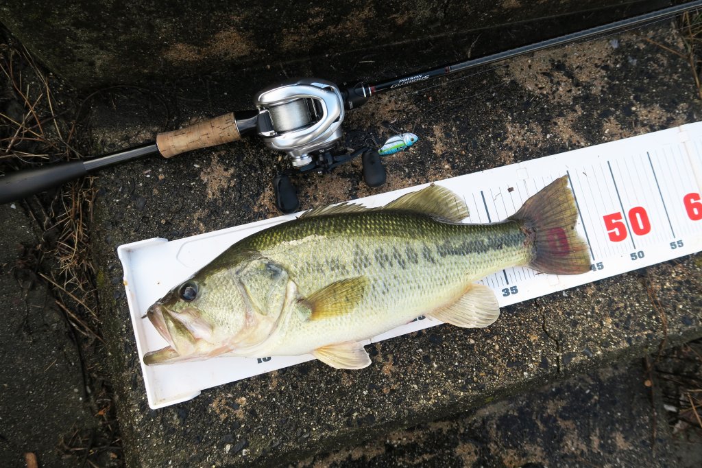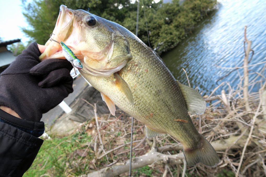 岸際はクリアアップしながらも底のほうは少し濁りが残る水質で、足元にはギルも確認できました。水深もそれほど深くないのでメタルバイブの釣りがしやすかったです。