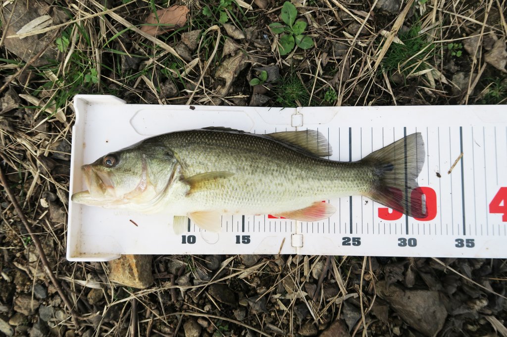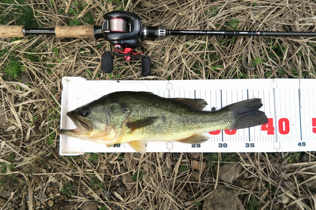 サイズはいまいちでしたがダウンショットで2本!ワームはHPシャッドテール2.5インチに2.2gのシンカーで、底に沈んでいる石にダウンショットを絡めながらズルズルしていると食ってきました。