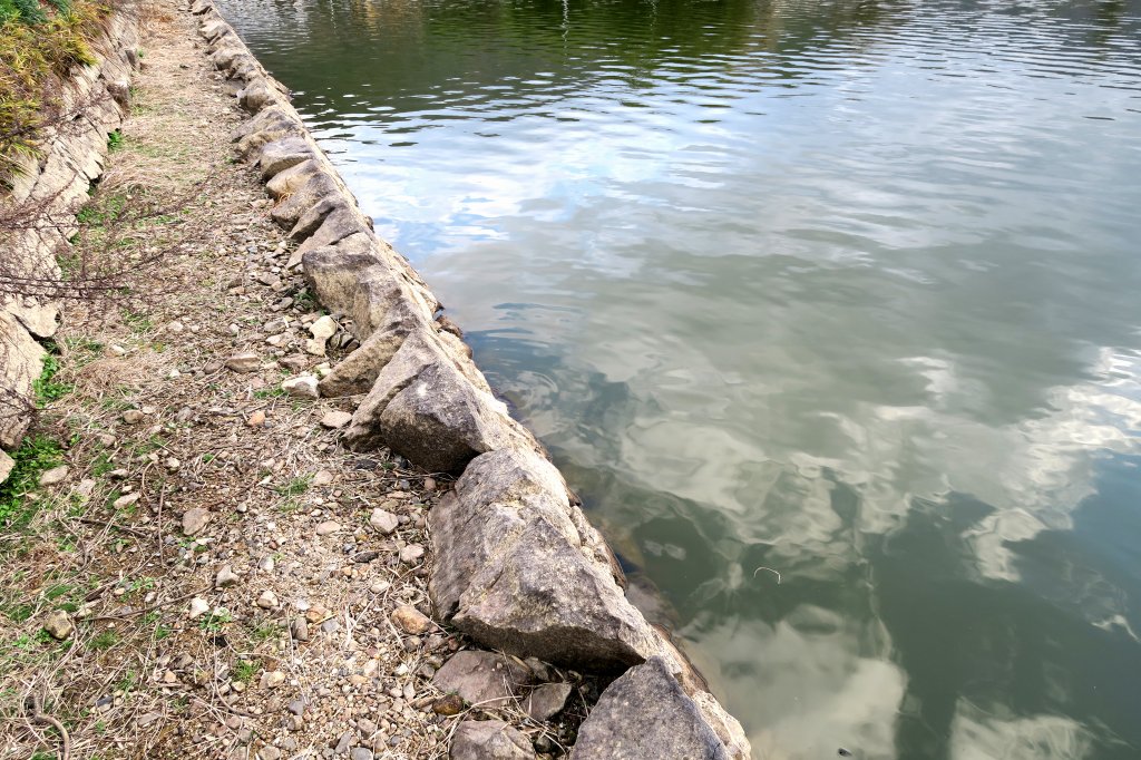 ここは足元に石が積んであり、所々崩れた石が沈んでいる場所です。普段は水中に沈んで歩けないので少し足場が高く釣りにくいのだが、減水していたので石積みを歩くことができるようになっていました。