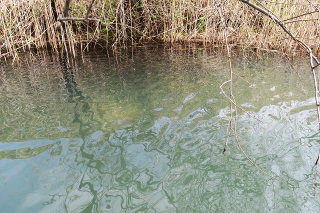 釣り進みながらシャローを見ていると所々が白くなっていてスポーニングベッドが池の至る所で確認できる。元々水温が暖かい場所なのでスポーニングはかなり早いようだが、ベッドの近くにバスの姿は確認できなかった。
