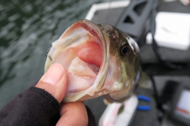同じ釣り方でコバスは5本くらい釣れけどサイズアップしない…。深いところで食わせたら浮き袋が出てきて心配だけど、逃がしたら元気良く帰って行ってくれた。