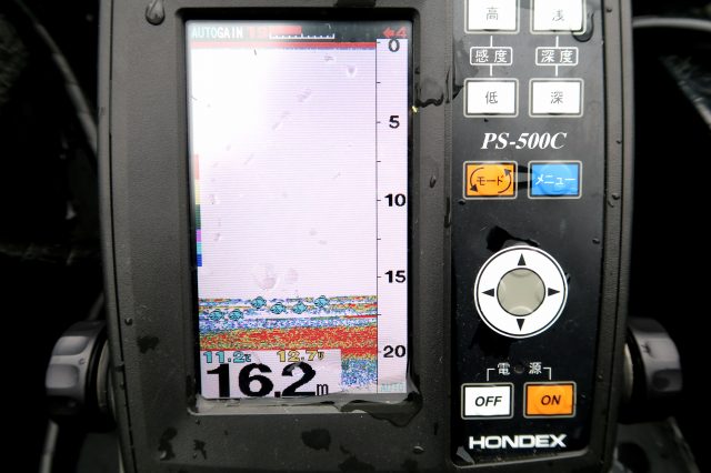 最初は岸際をダウンショットで一通りやってみたけどシャローでは何も反応がない…。岸から少し離れた辺りで魚探をかけていると水深16mの底に何やら魚の反応!